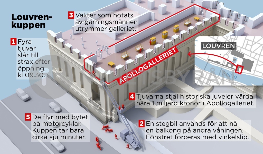Fyra tjuvar slog till mot museet Louvren i Paris den 19 oktober och stal på cirka sju minuter juveler värda nästan en miljard kronor.